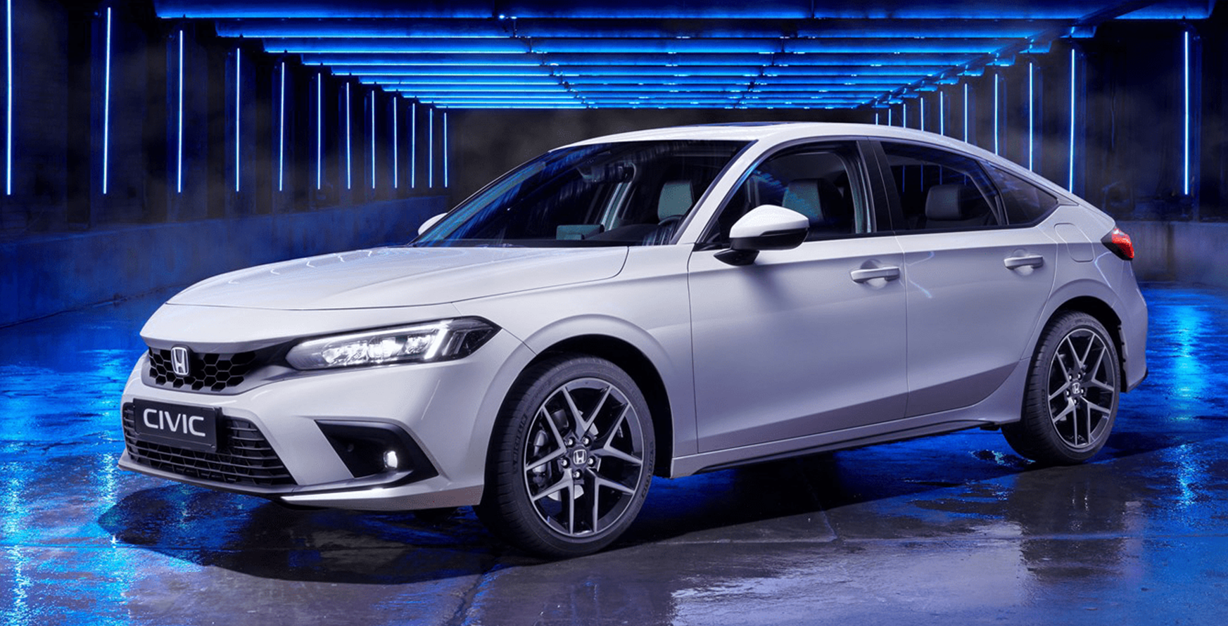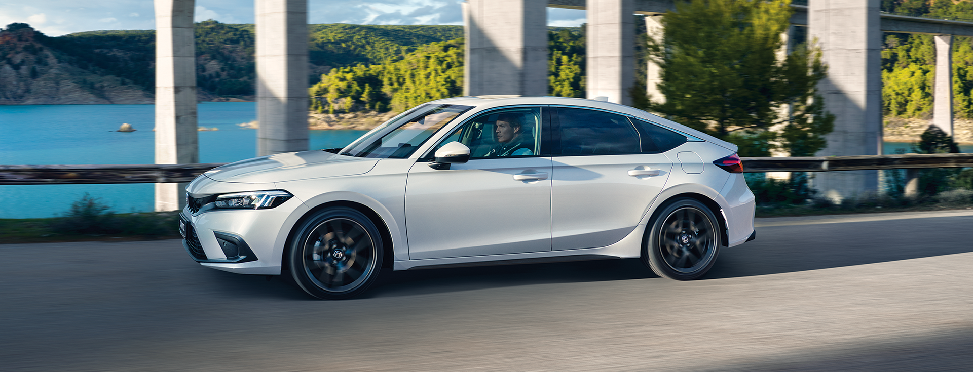 Le capot plat, les lignes épurées et les surfaces élégantes confèrent a la Honda Civic e:HEV un caractère frais et moderne.